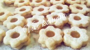 8. Ha kihűltek a megsült tészták, akkor egy telit és egy lyukasat lekvárral megtöltünk.